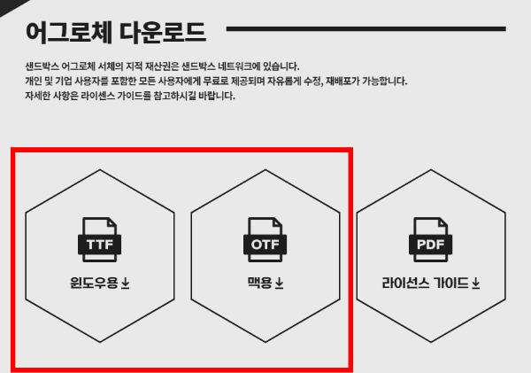 1. 아래의 "어그로체 폰트 다운로드" 를 클릭한 후, 화면의 스크롤을 내려 내 컴퓨터의 운영체제의 따라 "윈도우용" 또는 "맥용" 버튼을 누릅니다. 그러면, 자동으로 폰트를 Download 받게 됩니다.