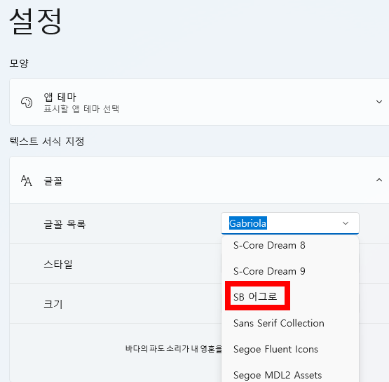3. 제어판에서 글꼴 폴더로 들어가, 오른쪽 상단 찾기 입력 란에 "어그로" 라고 입력합니다. 조금 전 설치한 폰트가 나오면, 설치가 완료된 것입니다.