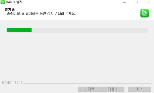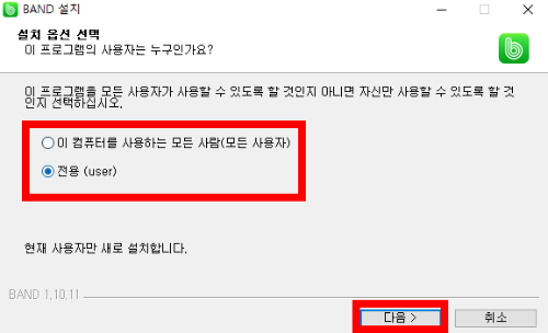 2. 받은 설치 파일 (파일명 : BAND-1.10.11)을 더블 클릭하면, 설치 마법사 창이 열립니다. 먼저, 설치 옵션을 선택한 후(보통 전용 USER를 선택합니다.), 다음을 누릅니다. 그리고 설치 위치를 선택한 후, "설치" 버튼을 누르면, 자동으로 설치가 진행됩니다.