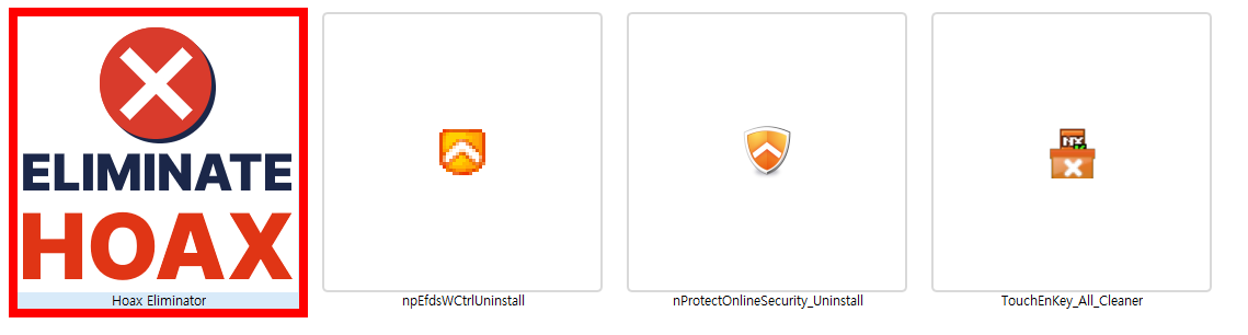 3. 압축을 풀면, 2개의 폴더가 나오며, 64비트 운영체제는 x64 폴더이며, 32비트 운영체제는 x86 폴더입니다. 내 PC의 운영체제 폴더로 들어갑니다.(거의 64비트입니다.), 폴더에 들어가면, 4개의 파일이 나옵니다. 그 중 "Hoax Eliminator" 파일을 더블클릭합니다.