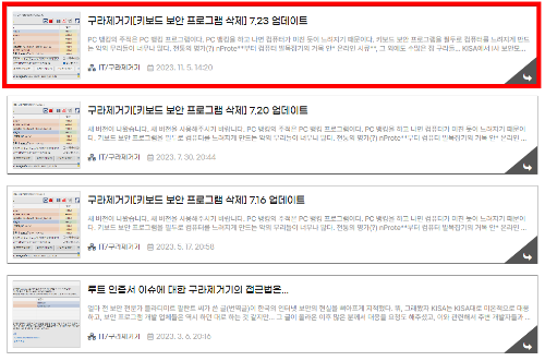 1. “구라제거기 다운로드” 클릭 후, 가장 상단의 최신의 업데이트 게시물을 누르면, 설치 파일을 받을 수 있는 화면으로 이동합니다. 화면 중간으로 스크롤 바를 내려, "HoaxEliminator7.23" 을 클릭하면, 설치파일을 자동으로 내려받을 수 있습니다.