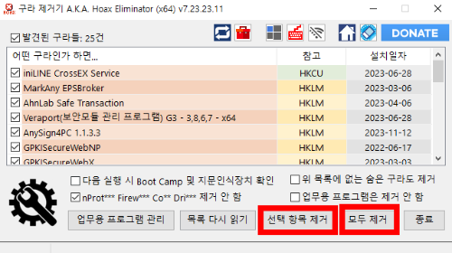 4. 프로그램이 실행되며, 우리의 PC를 느리게하는 각종 프로그램들이 나옵니다. 해당 프로그램 선택 후 "선택항목제거"를 누르면 선택한 항목만 삭제되며, "모두 제거"를 누르면, 전체 삭제됩니다.