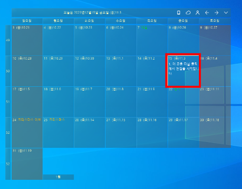 2. 일정 입력 : 일정을 입력할 날짜에 마우스 왼쪽 버튼을 더블 클릭하면, 편집창이 나옵니다. 해당 창에 스케줄을 입력하면 일정이 표시 됩니다.