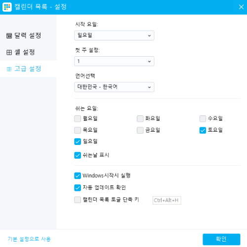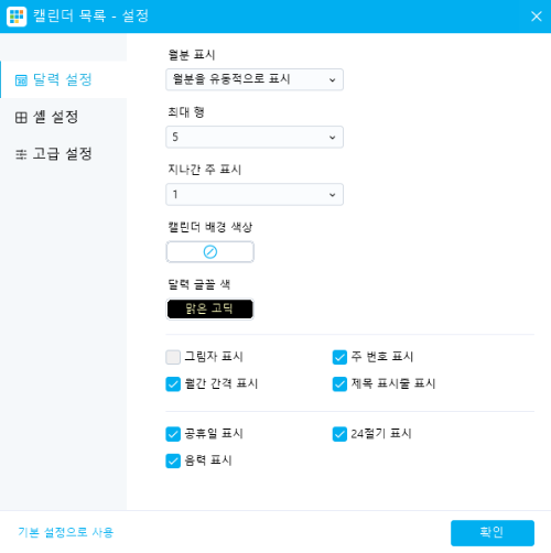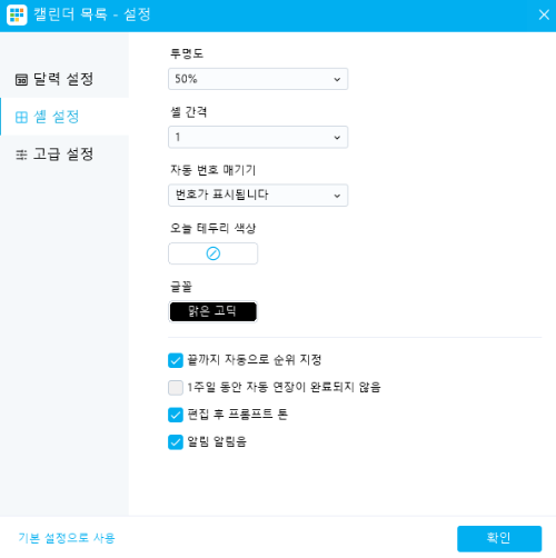 3. 환경설정 : 달력설정(월분표시, 최대행, 지나간 주 표시, 캘린더 배경색상, 글꼴), 셀 설정(투명도, 셀 간격, 바동 번호 매기기, 테두리 색상, 글꼴), 고급설정(시작요일, 첫 주 설정, 언어, 쉬는 요일) 으로 취향에 맞게 바꾸실 수도 있습니다.